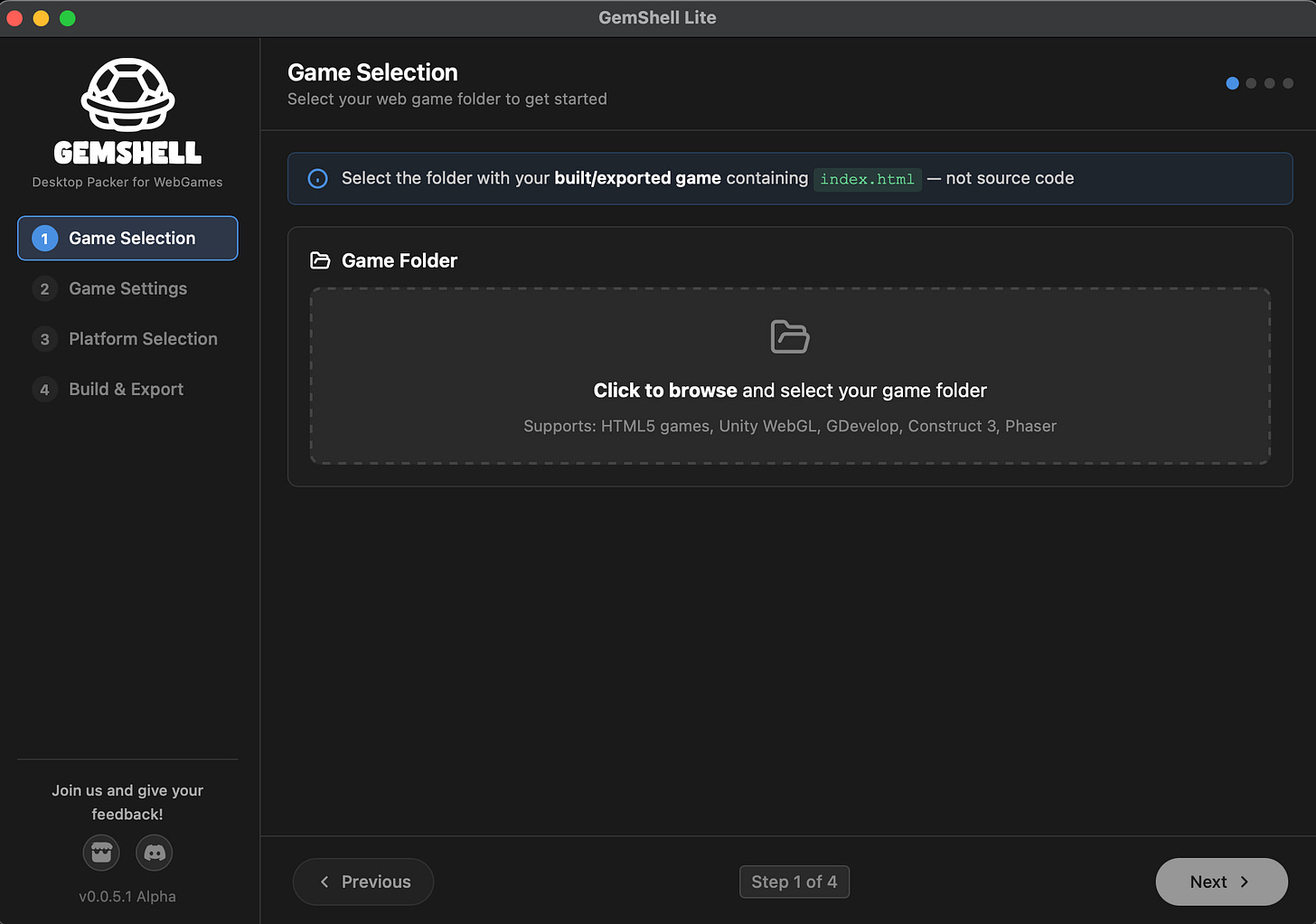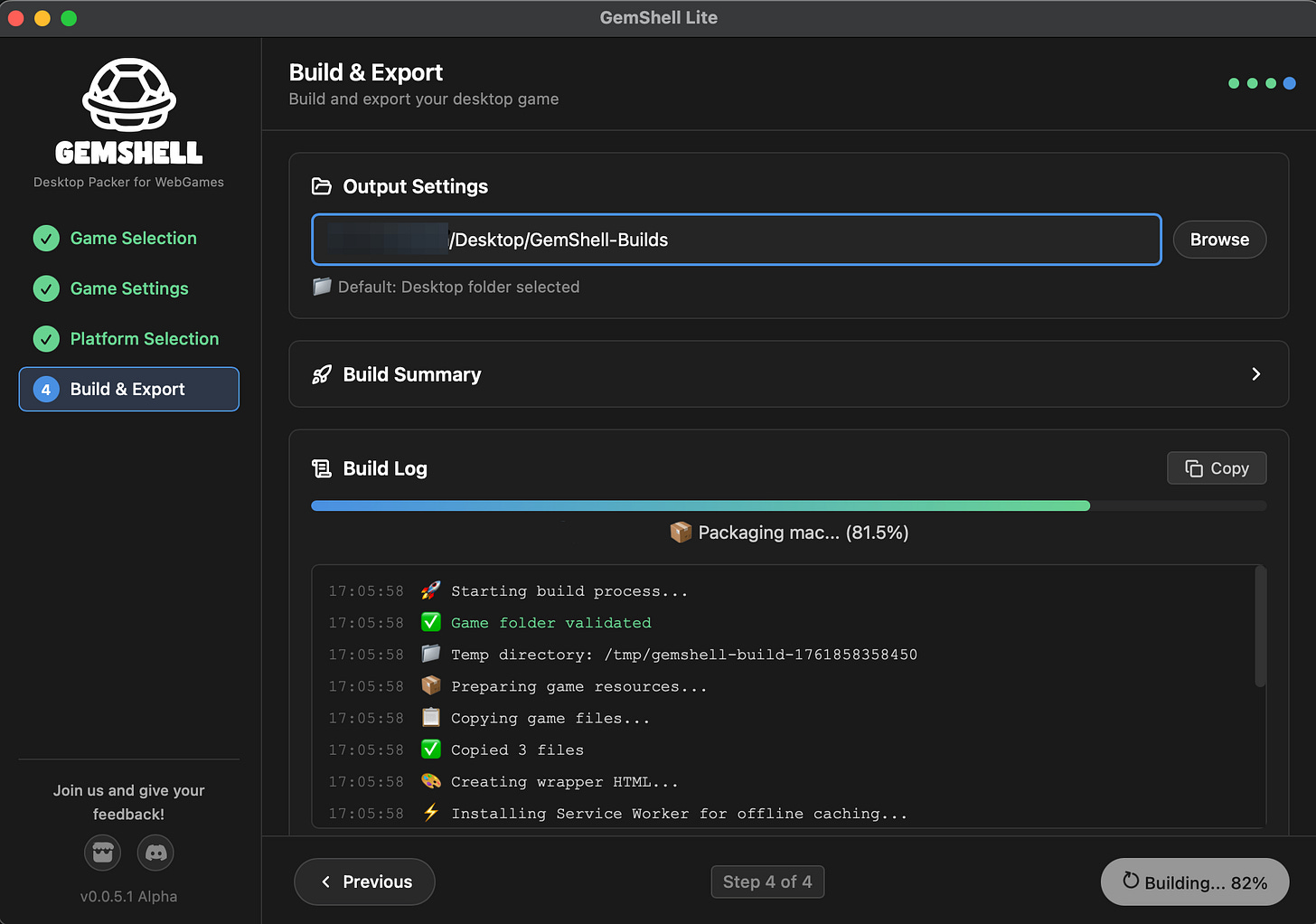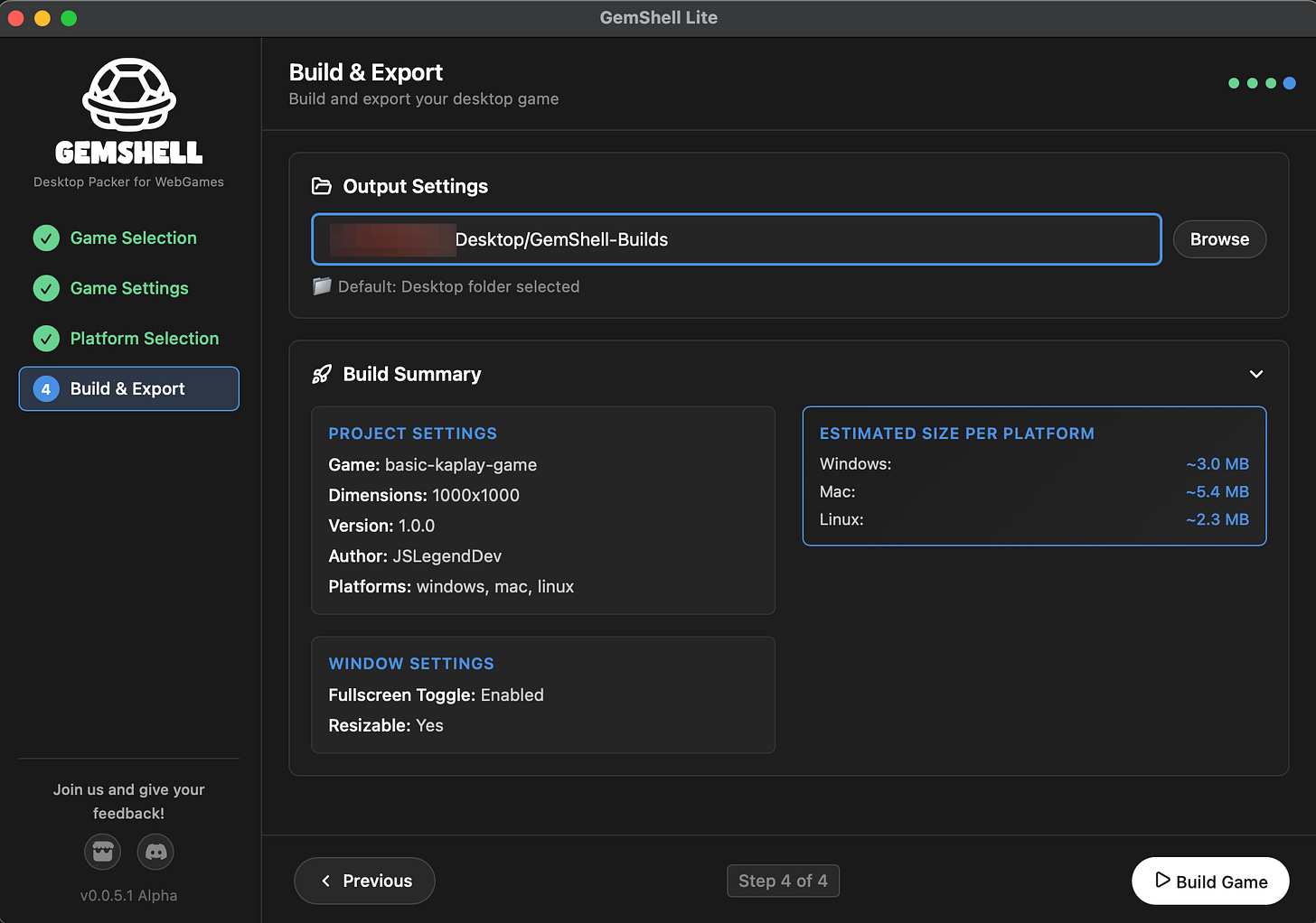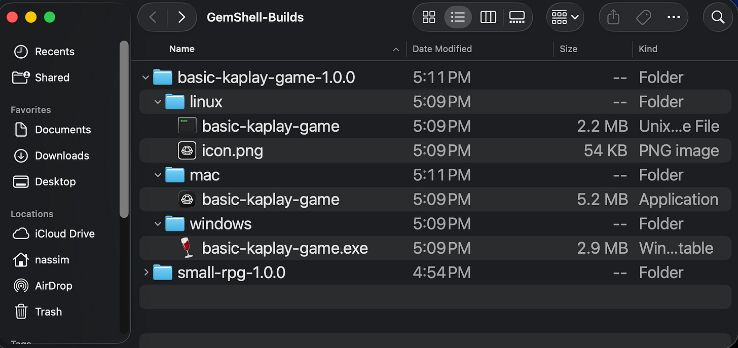 GemShell will put all the builds relevant to your game in a folder called GemShell-Builds which will be created in the Desktop directory of your computer (if it doesn’t already exist).