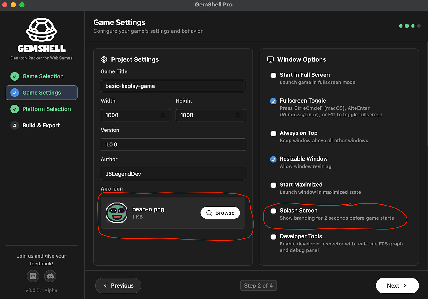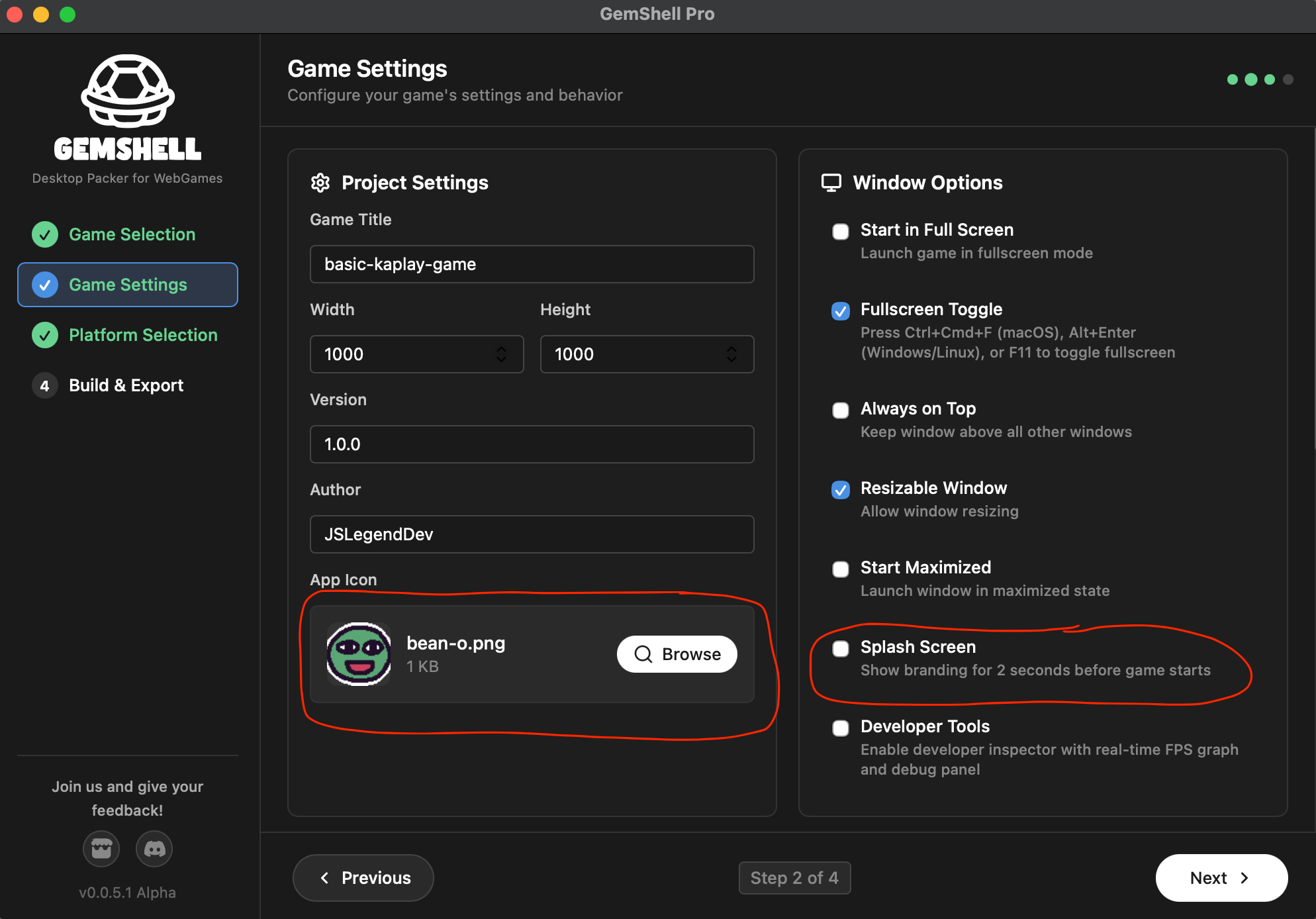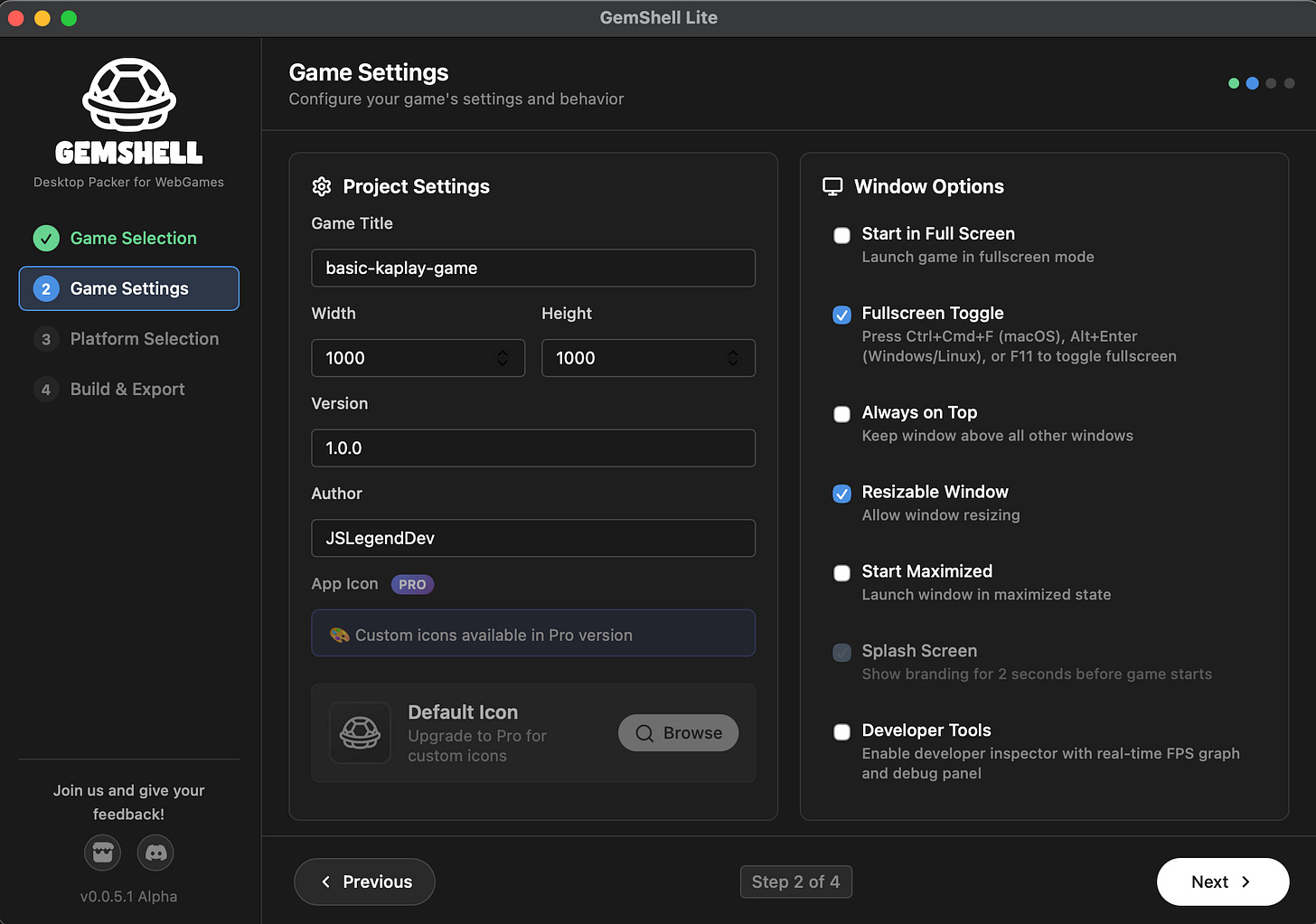 Once the relevant folder is provided. You can go to the next section where you’ll be able to configure your game’s metadata like its title, window dimensions, author, whenever you want the window to be resizable, etc…