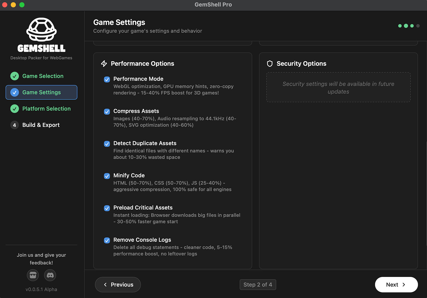 Preload Critical Assets : Claims to increase game start speed by 30-50% by downloading big files in parallel. I think this feature is mostly targeted to devs making muliplayer games where the desktop app is a client of some sort. Personally, I have not noticed a difference but remember that the games I make use pixel art based assets which are usually small in size. I would also like to note that regardless of if you use the Lite or Pro version, they both load extremely quickly when I tested them. The only difference is due to the splash screen taking 2 seconds before the game actually starts which is near instantaneous.