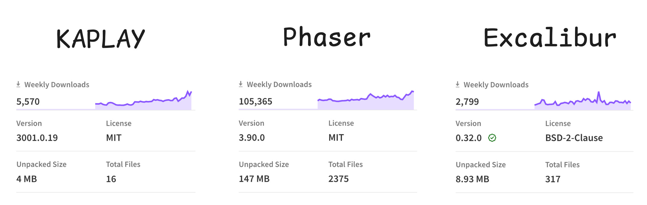 Note that even though KAPLAY markets itself as a library and Excalibur as a game engine they still feel like frameworks and occupy the same space as Phaser. That’s why I took the liberty to refer to them as frameworks.