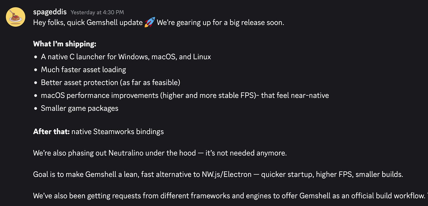Similar to Tauri in how it uses the operating system’s webview to render the app rather than packaging a Chromium instance. This results in leaner executables but different web engines with varying performance differences are used on different platforms. However, contrary to Tauri, GemShell is a one click tool that generate executables for all three platforms.
