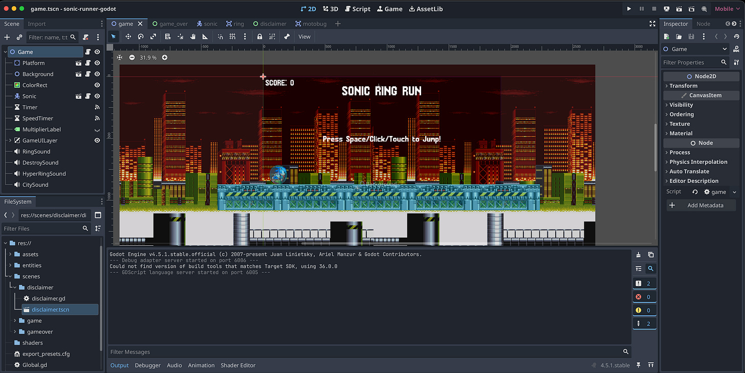 Anyway, if you want to try both the Phaser and the Godot versions of my Sonic game, they’re both available to play on the web. Here are the links:
